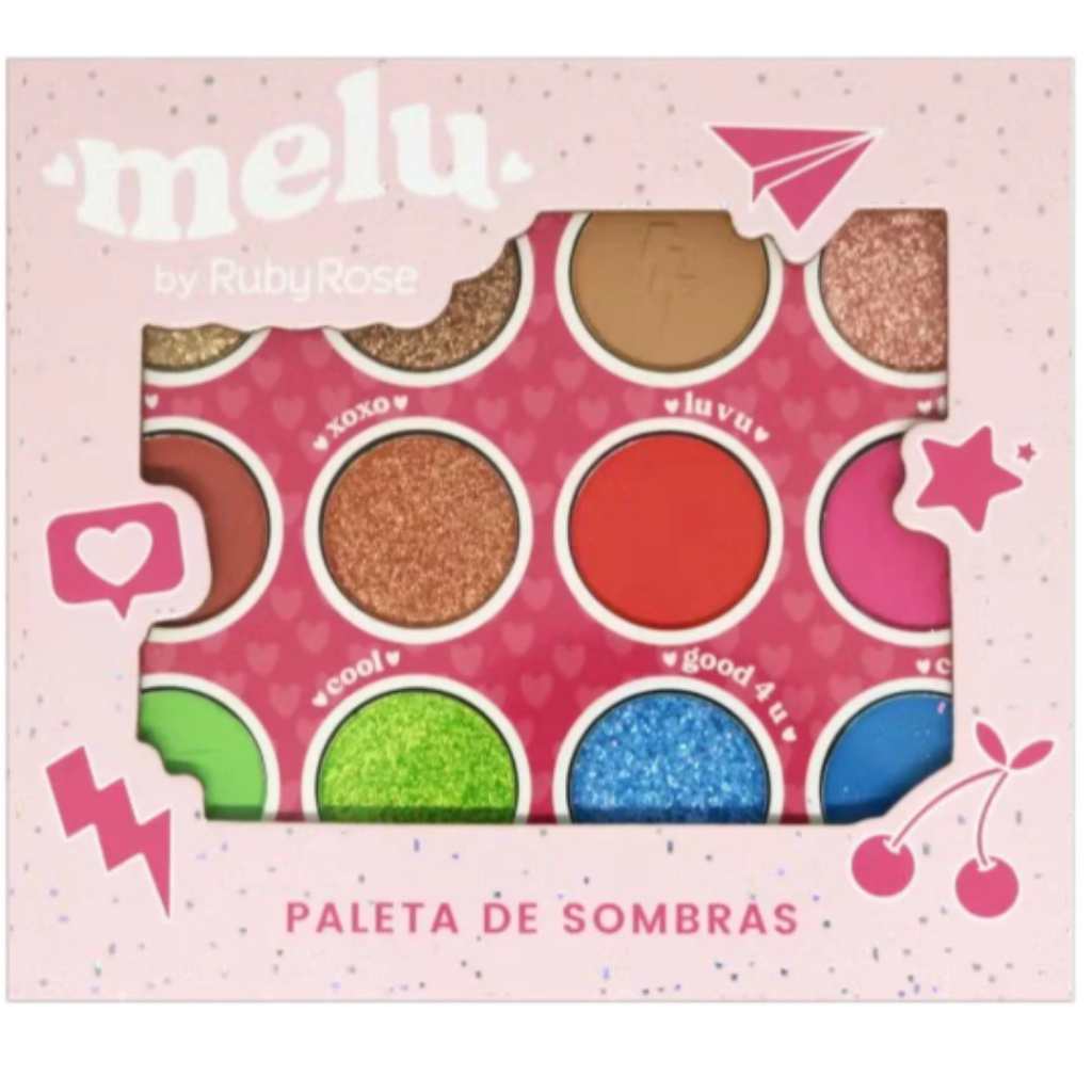 A Paleta de Sombras Melu By Ruby Rose modelo HB-1085 possui 12 lindas cores, sendo sombras metalicas, Sombras Matte e Sombras Glitter.